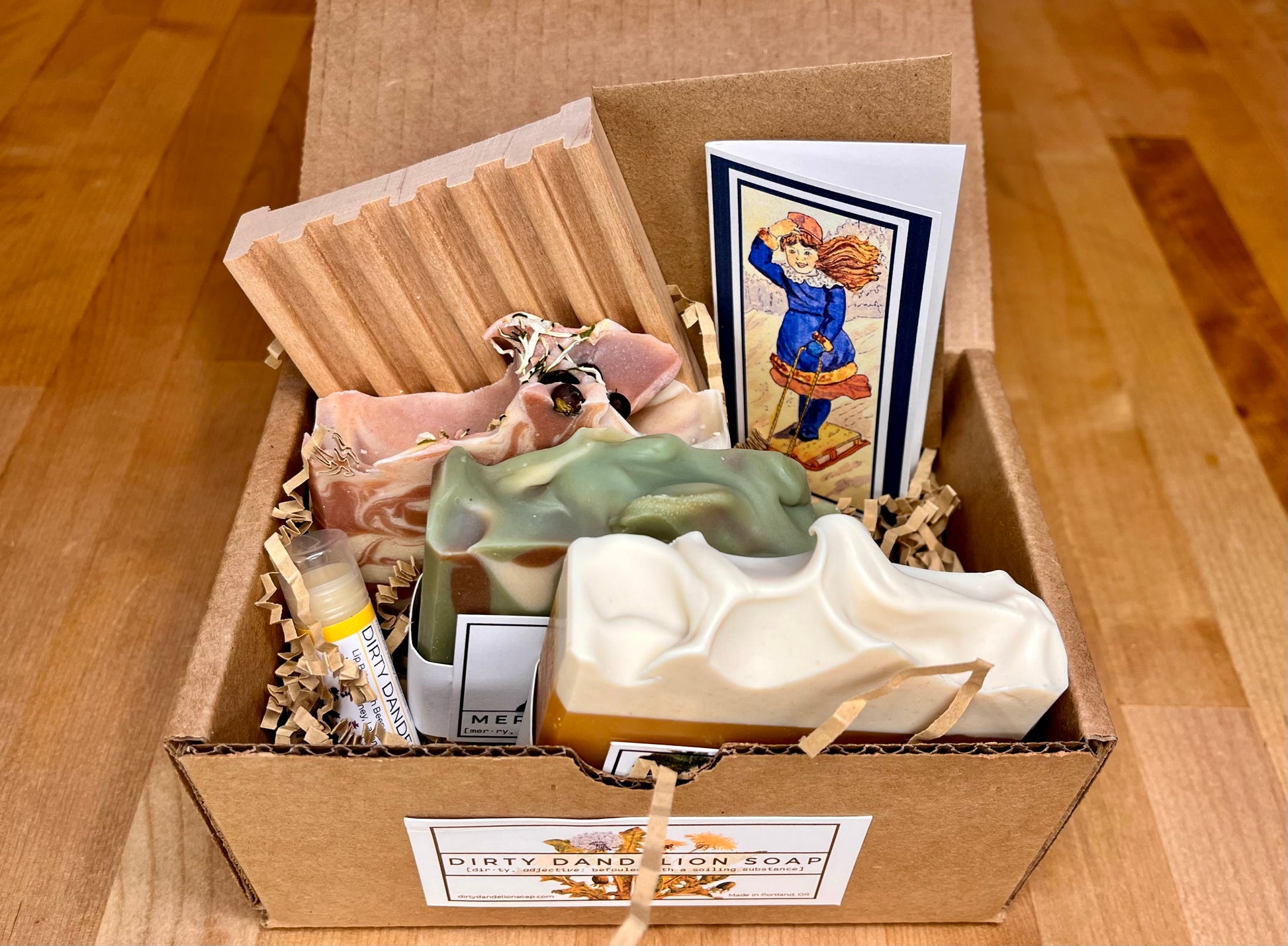 We’ll tuck away three holiday-themed soaps with a hardwood soap dish, a soothing lip balm and a gift card of your choice — ready to give (we mail it directly to your recipient, or to you for hand delivery).