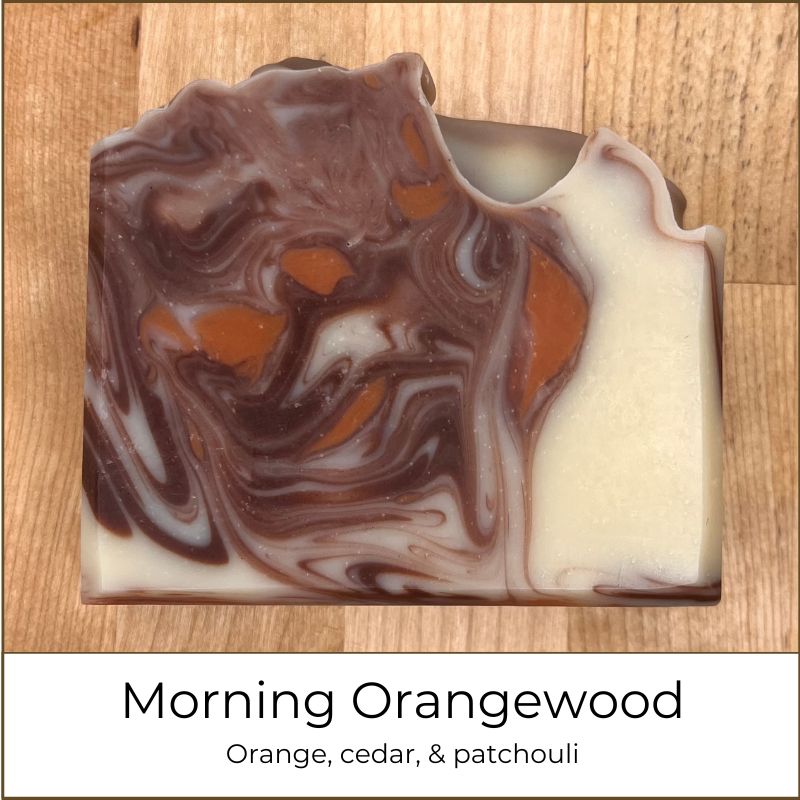 Morning Orangewood: 100% pure essential oils of orange, patchouli, & cedarwood; *extra virgin olive oil, RSPO palm oil, *coconut oil, *shea butter, *cocoa butter, & castor oil; orange clay, *cocoa powder, rosemary oleoresin, & sodium lactate.