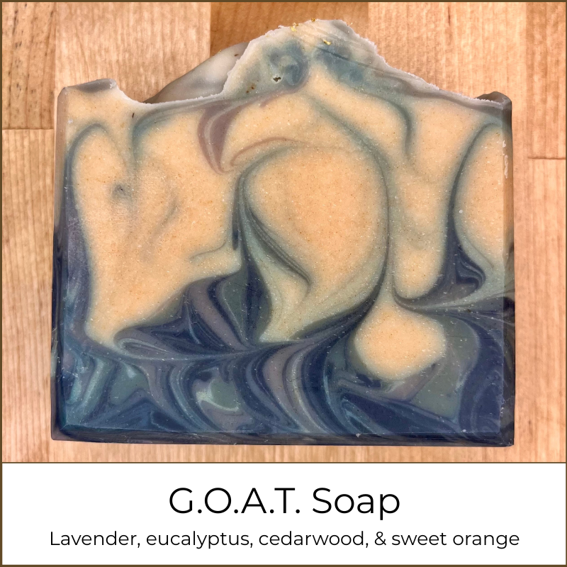 G.O.A.T Soap: 100% pure essential oils of lavender, eucalyptus, orange, & cedarwood; *chamomile-infused extra virgin olive oil, *RSPO palm oil, *coconut oil, *babassu oil, *mango butter, cocoa butter, & *castor oil; kaolin clay, goat milk, indigo, clays, purple oxide, rosemary oleoresin, sodium lactate. *organic