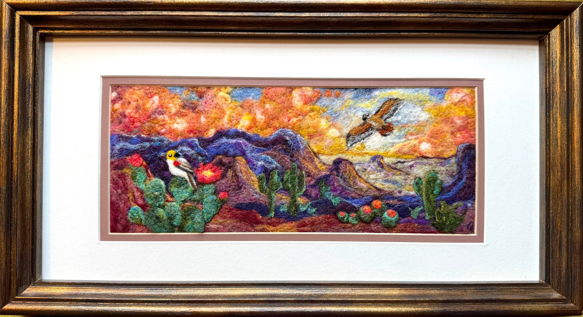 Desert Away from Home — a sweeping panoramic landscape captures the drama of the American Southwest at golden hour. A verdin perches on a blooming cactus in the foreground while a red-tailed hawk soars through a blazing sky of orange, red, and gold above rolling purple mountains. Saguaros and prickly pear dot the desert floor in rich, textured wool.