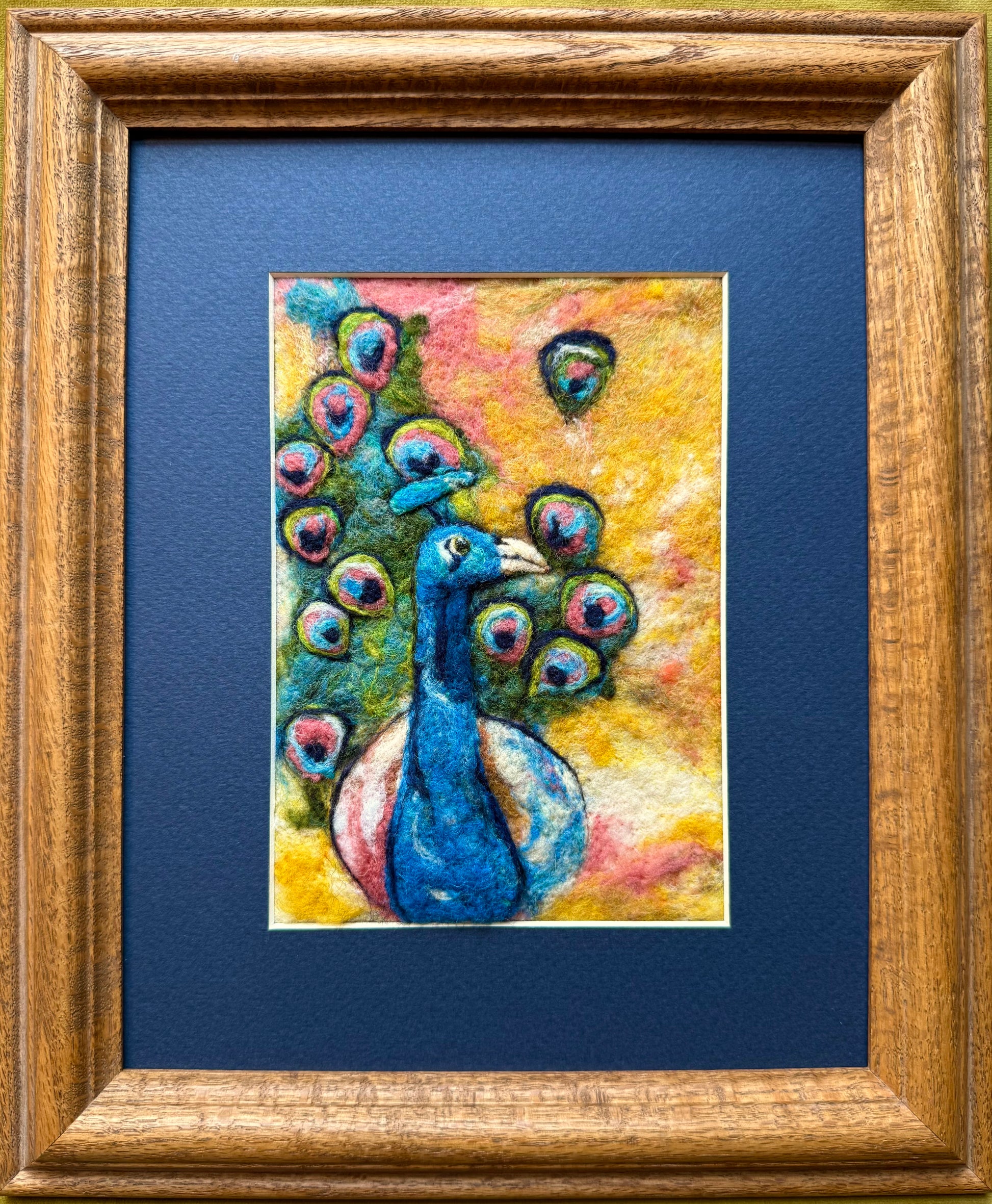 Pristine Peacock bursts with color and confidence — a vivid blue peacock fans its magnificent tail against a warm golden and rose background, each feather eye rendered in jewel tones of teal, pink, and green. Rich in texture and detail, this piece commands attention.