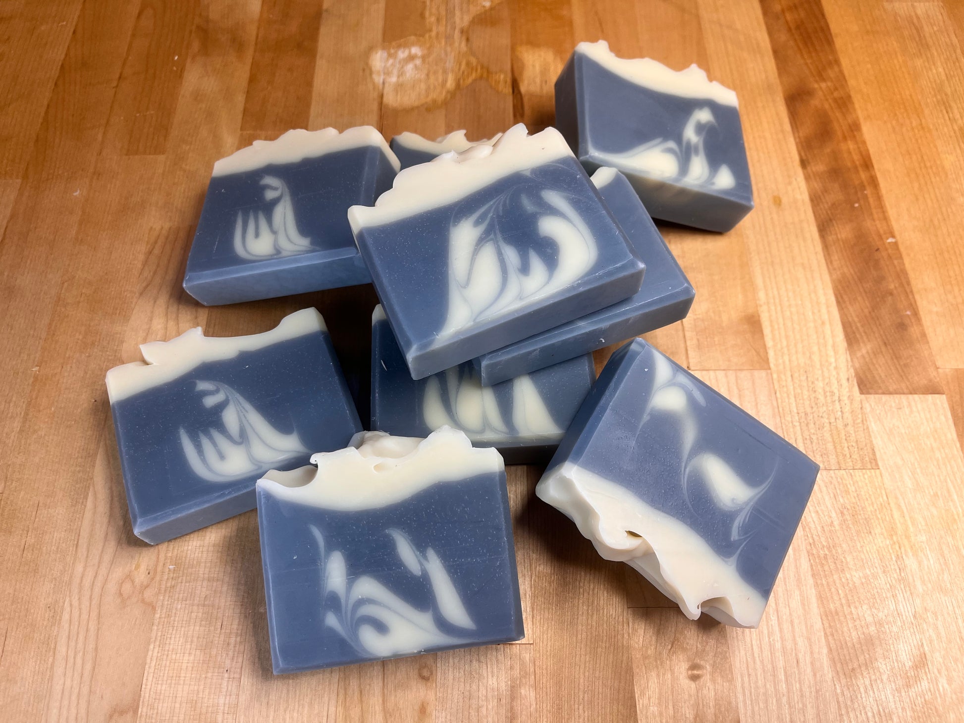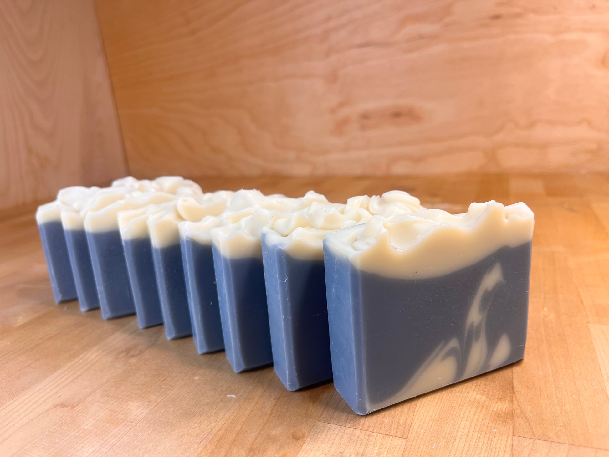 Ingredients: Organic extra virgin olive oil, organic high oleic sunflower oil, organic coconut oil, organic RSPO palm fruit oil, organic shea butter, and castor oil; cocoa butter. Additives include white kaolin clay, indigo, and essential oils of peppermint, orange, anise, & clove.