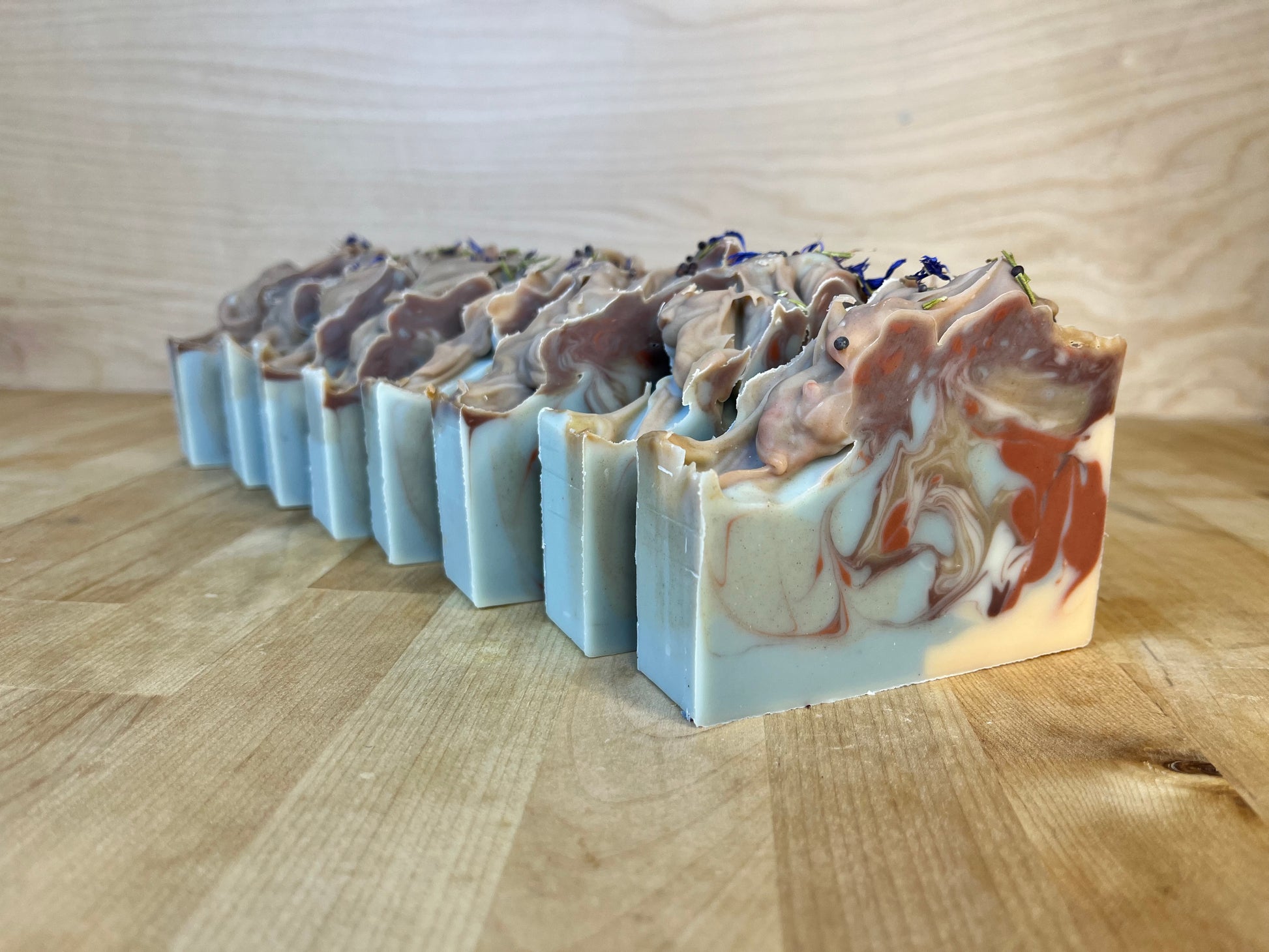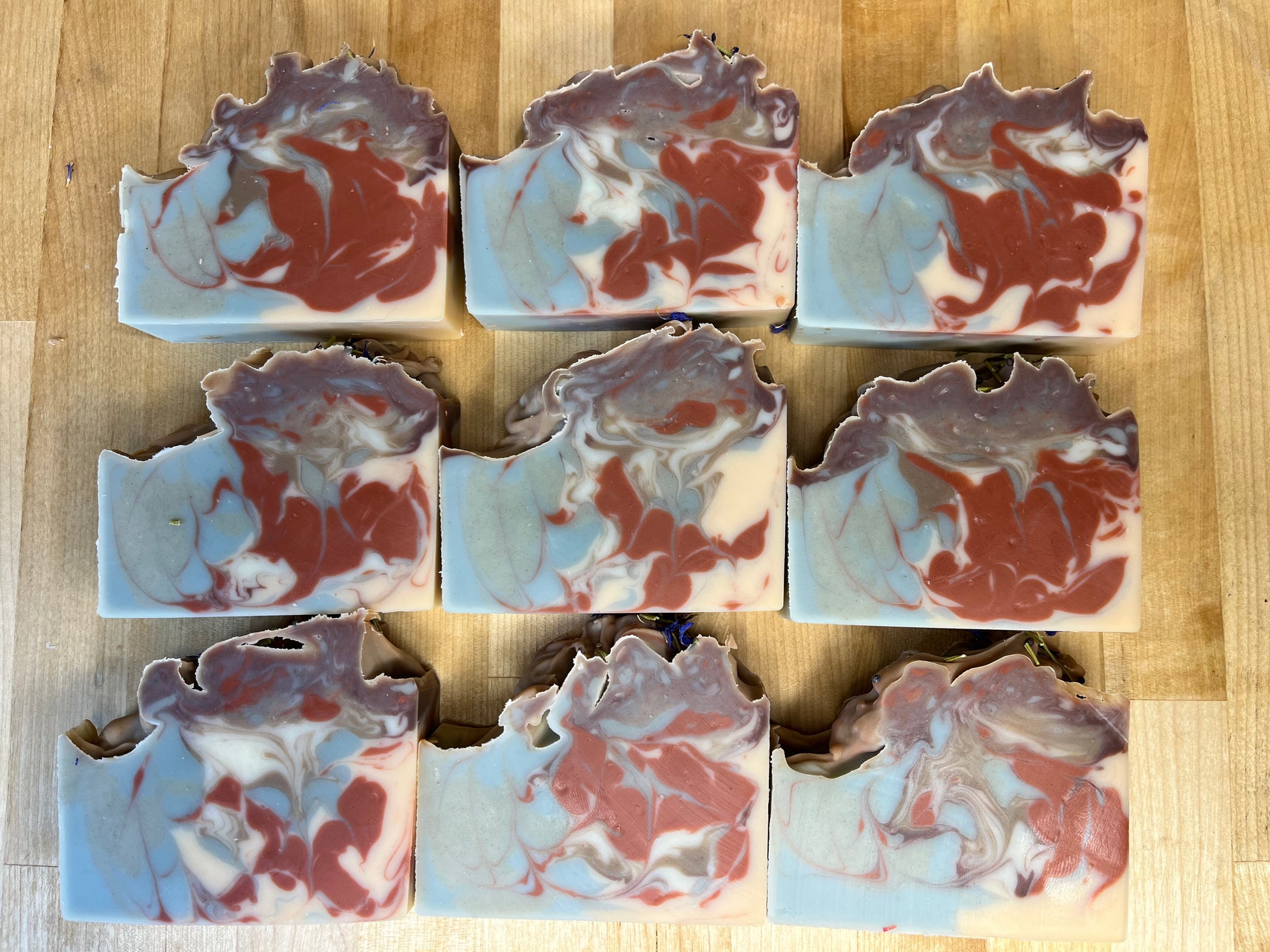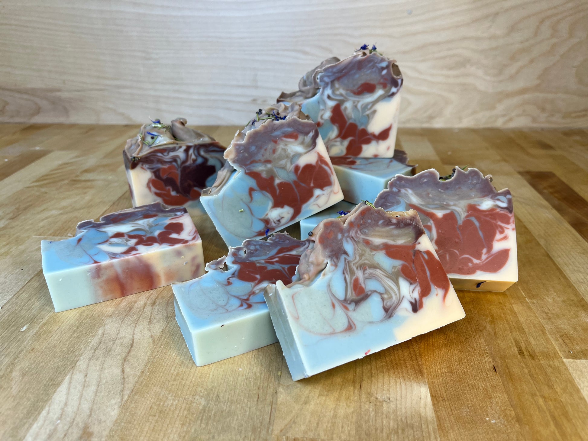 Ingredients: organic RSPO palm fruit oil, organic extra virgin olive oil, organic coconut oil, and castor; butters of cocoa and organic shea; colors from clays, paprika, annatto, cocoa powder, and indigo; rosemary oleoresin, sodium lactate. Pure essential oils of rosemary, eucalyptus, & cedarwood.