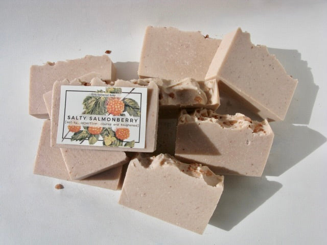 Inspired by the wild salmonberries that grow along salty coastal trails, this bar captures their bright, untamed spirit without a drop of berry oil (no berries was harmed in this venture). Instead, we’ve improvised a scent that’s as fresh as a coastal breeze.