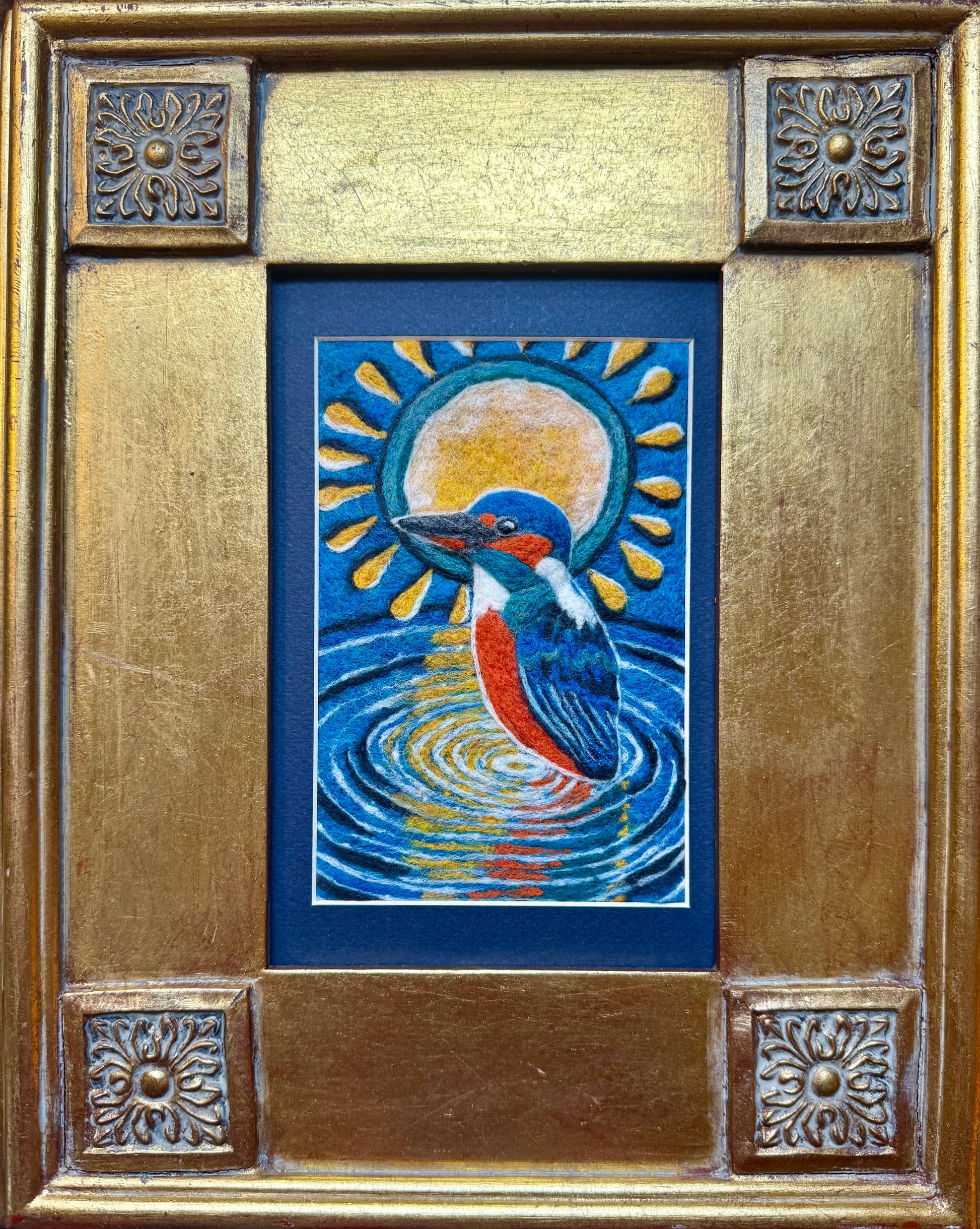 The King's Kingfisher captures a kingfisher mid-dive, emerging from golden-rippled water beneath a radiant sun. Rich cobalt blue, burnt orange, and teal come together in this vibrant felted painting — presented in an ornate gold frame.