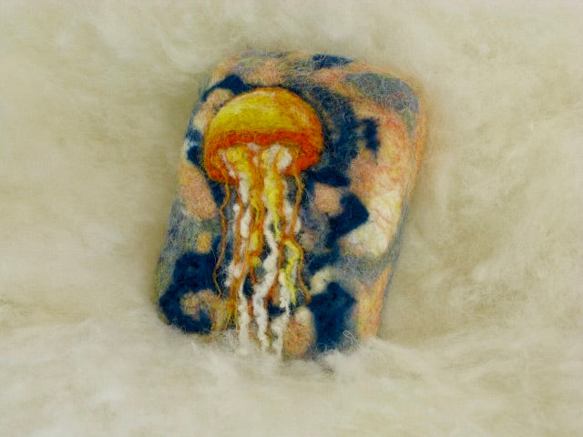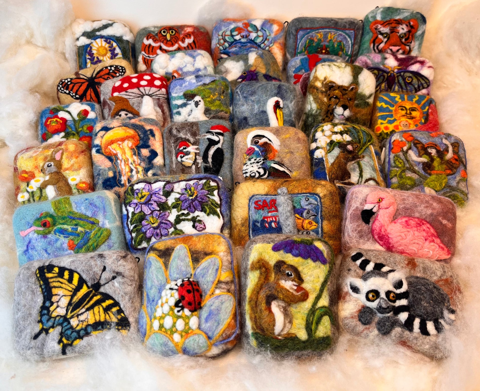 Our Wooly Washers are hand-felted artisanal soaps wrapped in soft, 100% wool roving, then wet-felted to form a durable felt cover. Artist, Ella Hauwiller, then meticulously needle-felts unique designs. The result: a one-of-a-kind, functional work of art—great for gifting, travel, camping, limited dexterity, or making bath time more fun.
